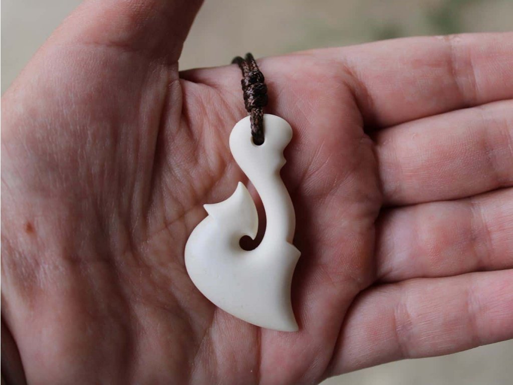 Háček na ryby označuje důležitost rybolovu pro Maory a jejich silný vztah s Tangaroa, bohem moře.