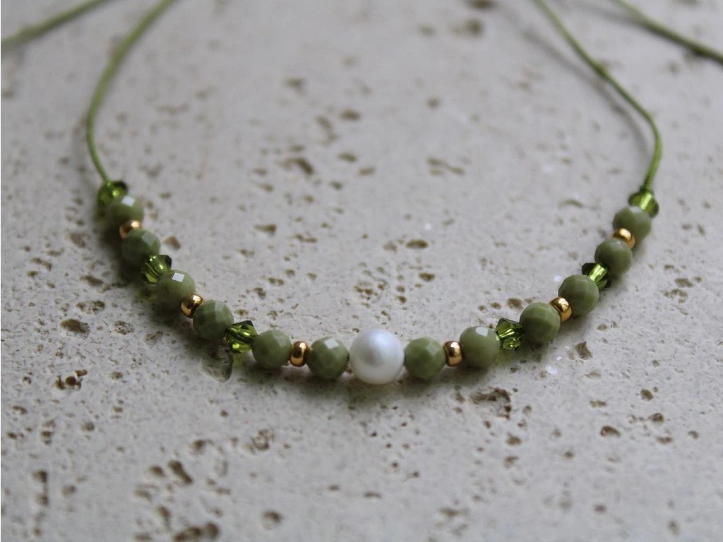 kanadský jadeit (3mm), sladkovodní perla, nylonová šňůra (0,4mm), skleněné korálky