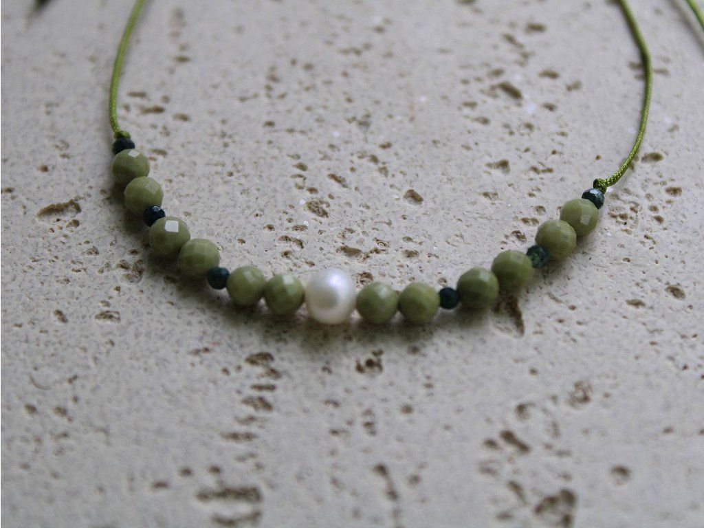 kanadský jadeit (3mm), africký jadeit (2mm), sladkovodní perla, nylonová šňůra (0,4mm),