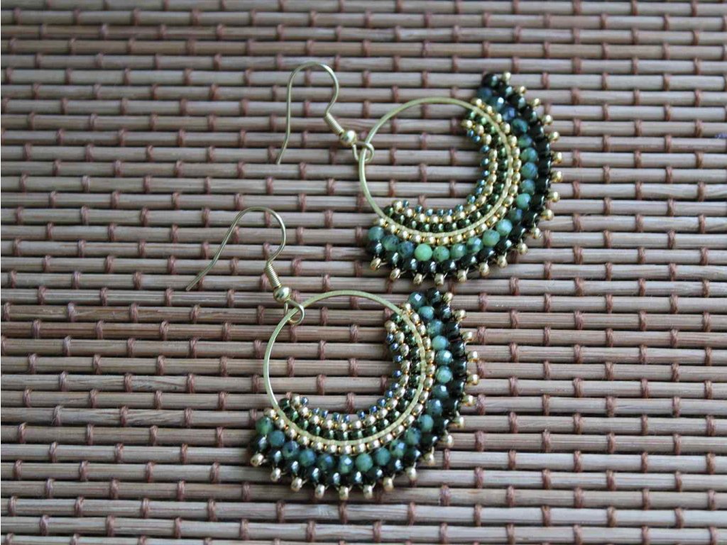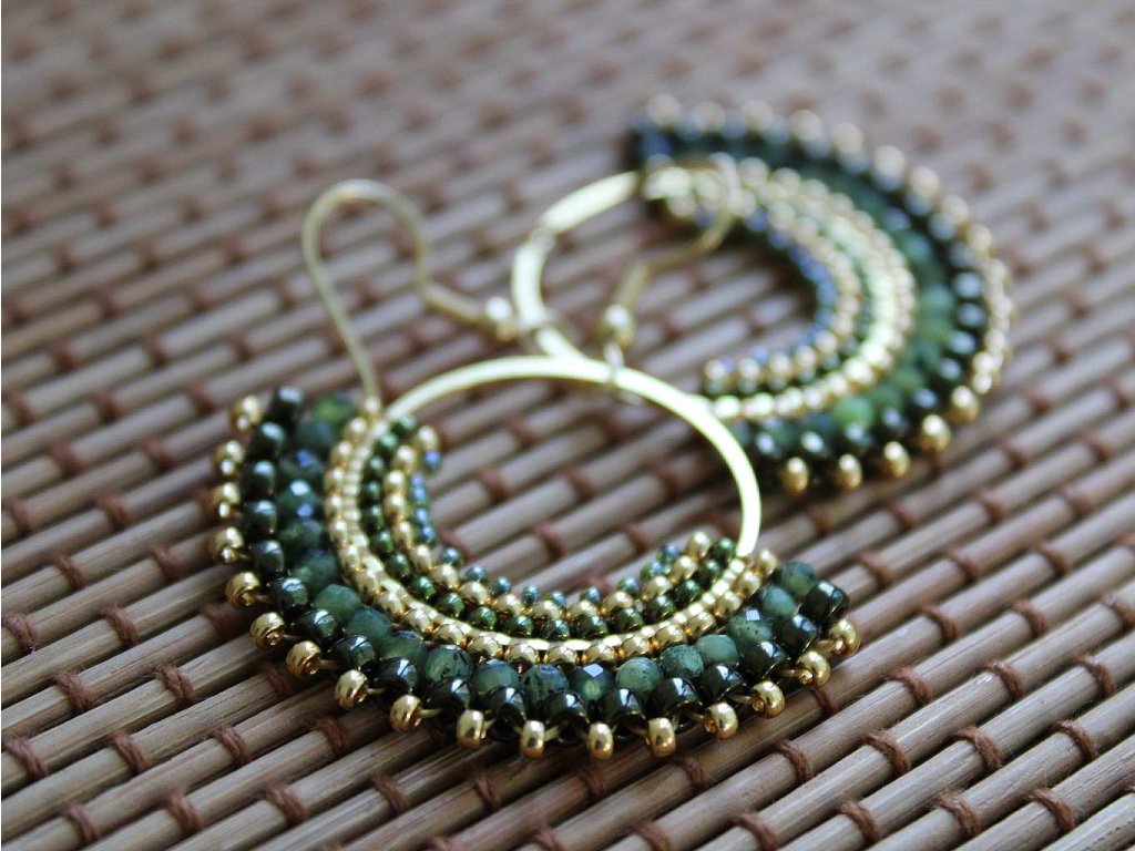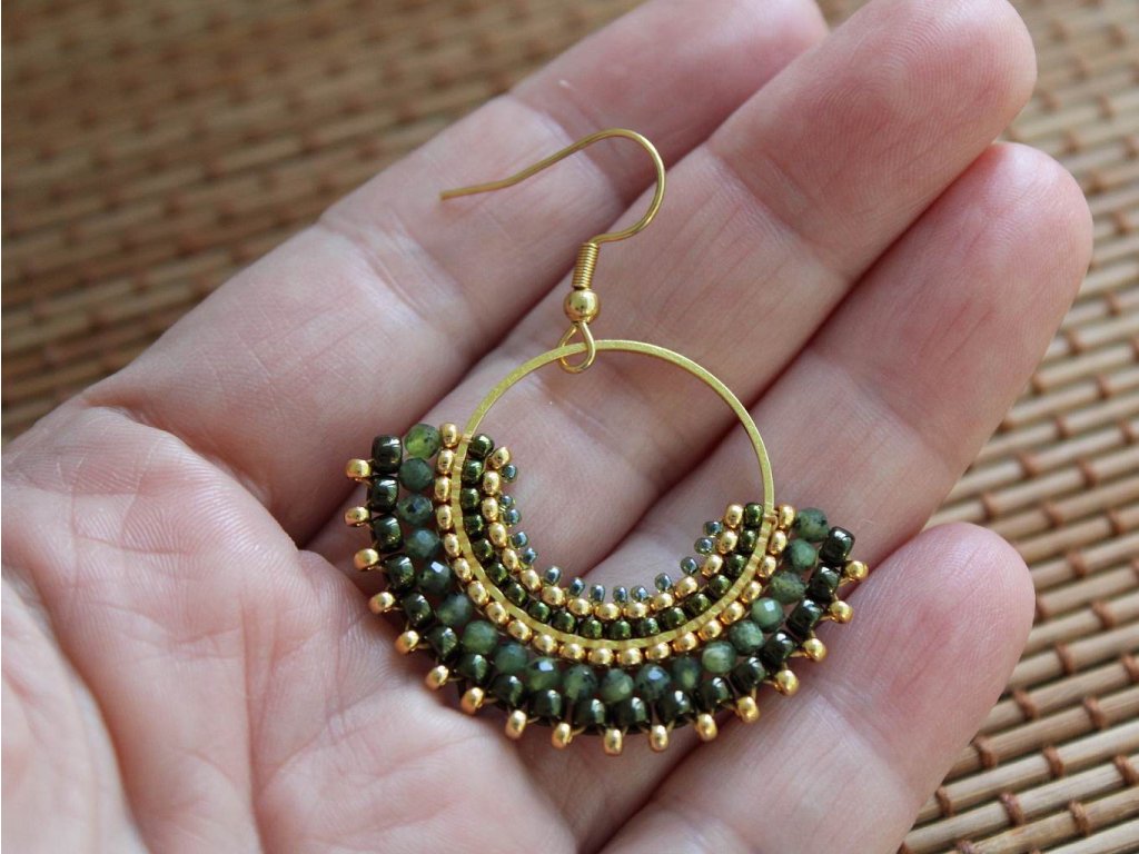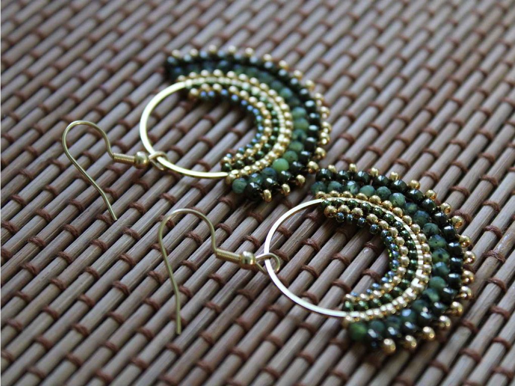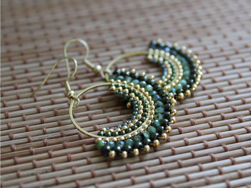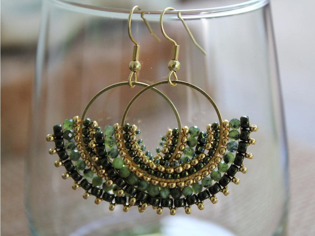 Objevte krásu ručně šitých náušnic, které propojují přírodní jadeit, třpytivé skleněné korálky a precizní řemeslné zpracování.