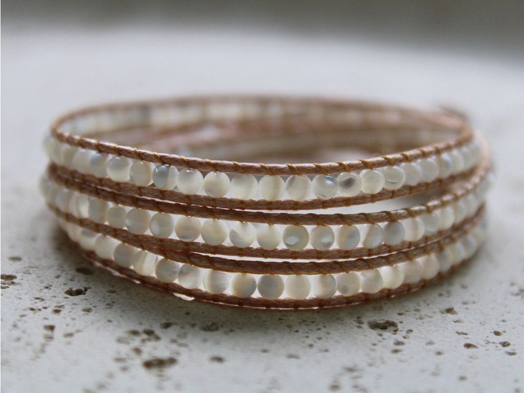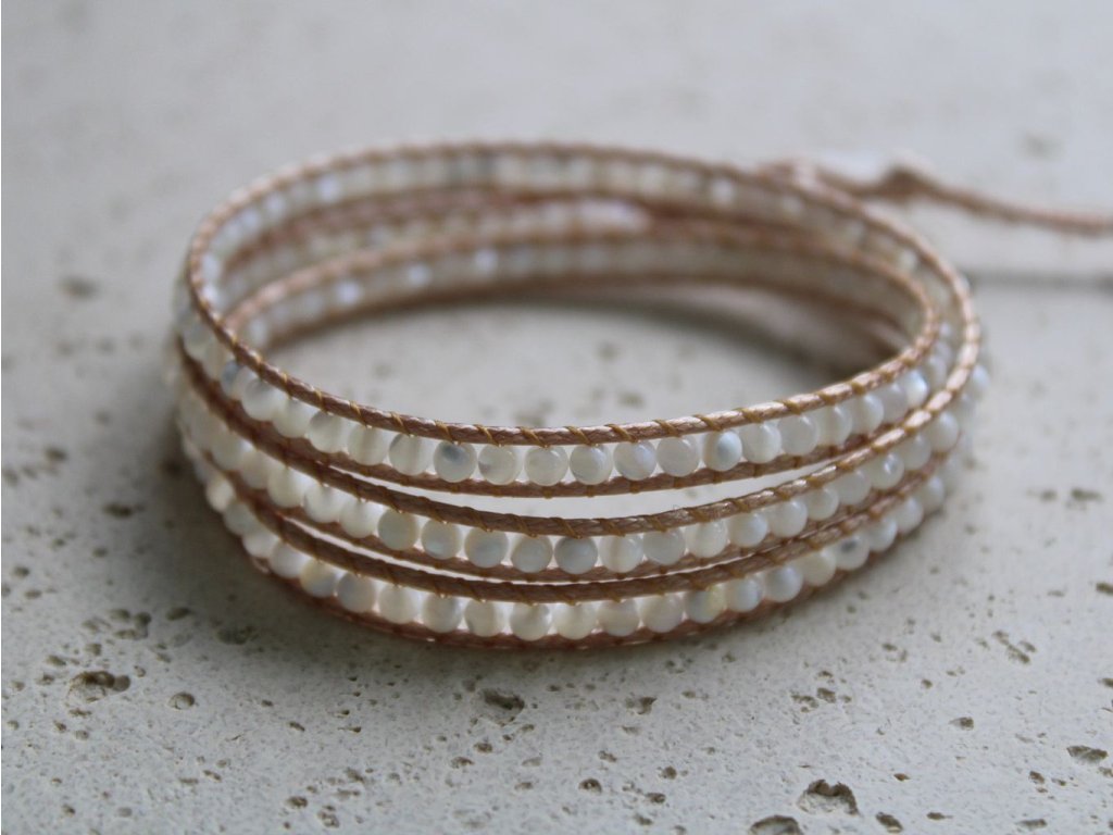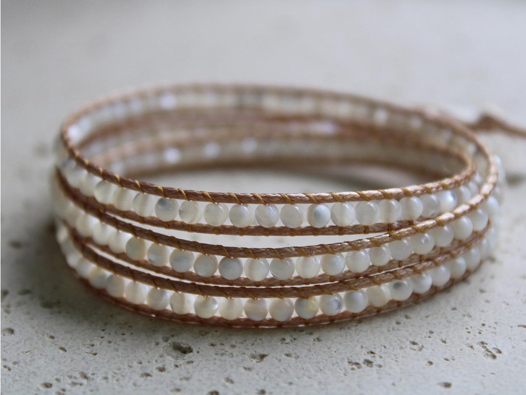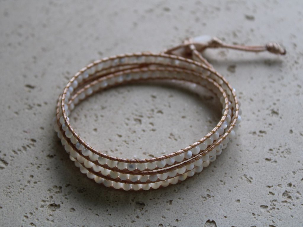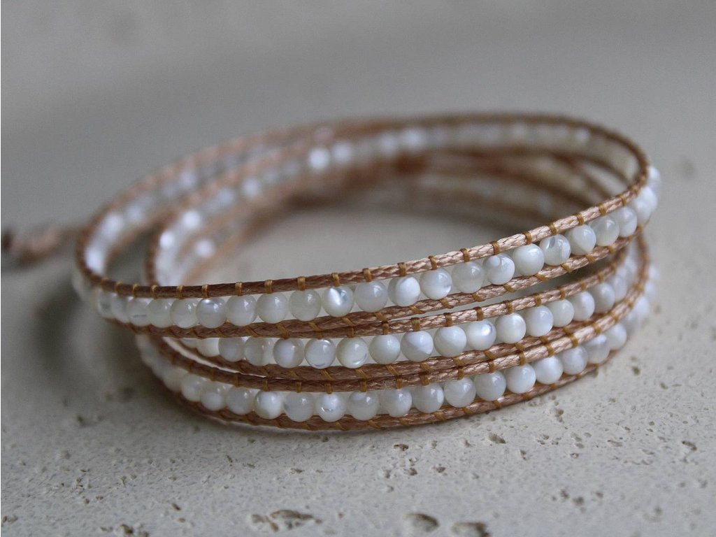 WRAP náramek - ručně motaný náramek z nebroušených korálků perleti, voskované šňůry, pevné nitě a kostěného korálku, který slouží jako zapínání.