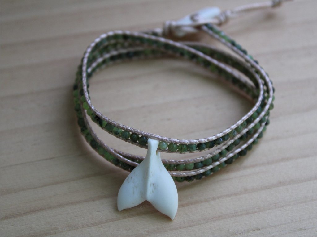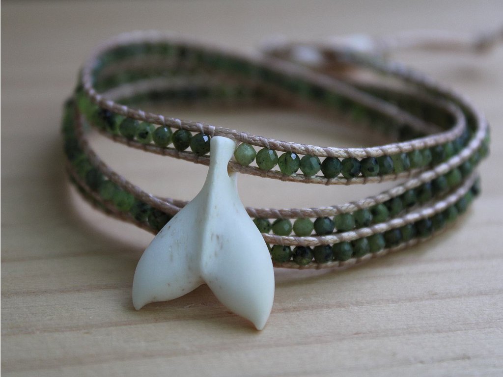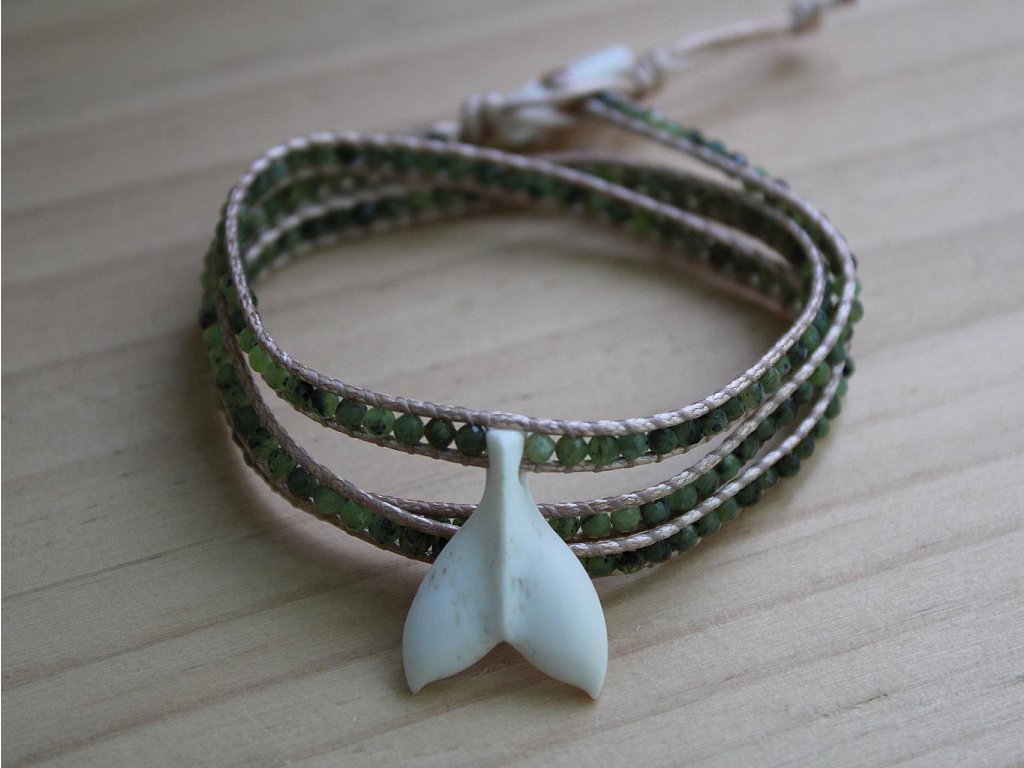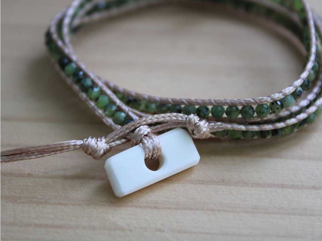 WRAP náramek - ručně motaný náramek z broušených českých korálků, minerálů, voskované šňůry, pevné nitě a kostěného korálku, který slouží jako zapínání.