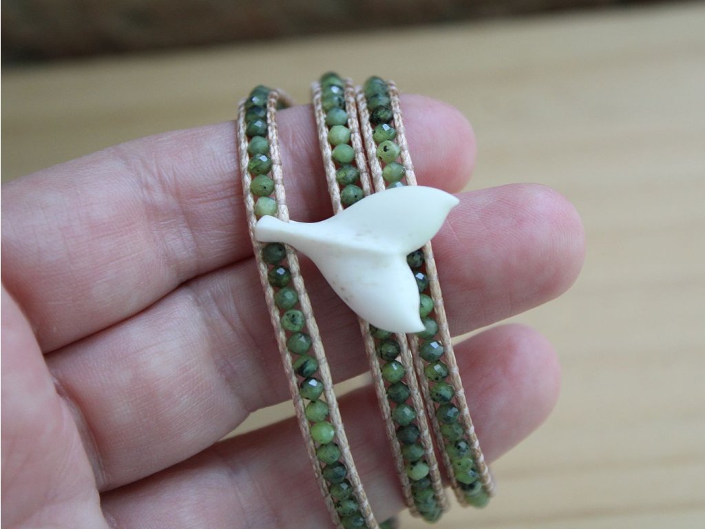 Náramek se omotává kolem zápěstí na tři otočky a kostěný knoflíček složí jako zapínání.